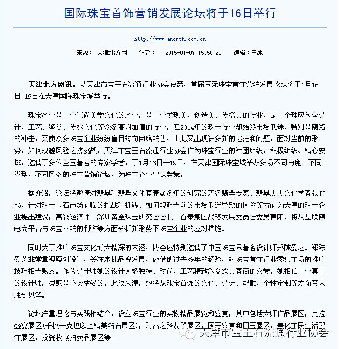 天津市首届国际珠宝首饰营销发展论坛新闻发布会于2015年1月6日在国际珠宝城举行后,引起媒体的高度关注,现已有天津日报等多家媒体进行发布和转载!下面是北方网记者针对此次新闻发布会发出的报道。